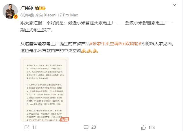 盧偉冰宣布小米將發(fā)布自產(chǎn)中央空調(diào)2025-12-11 11:48:17